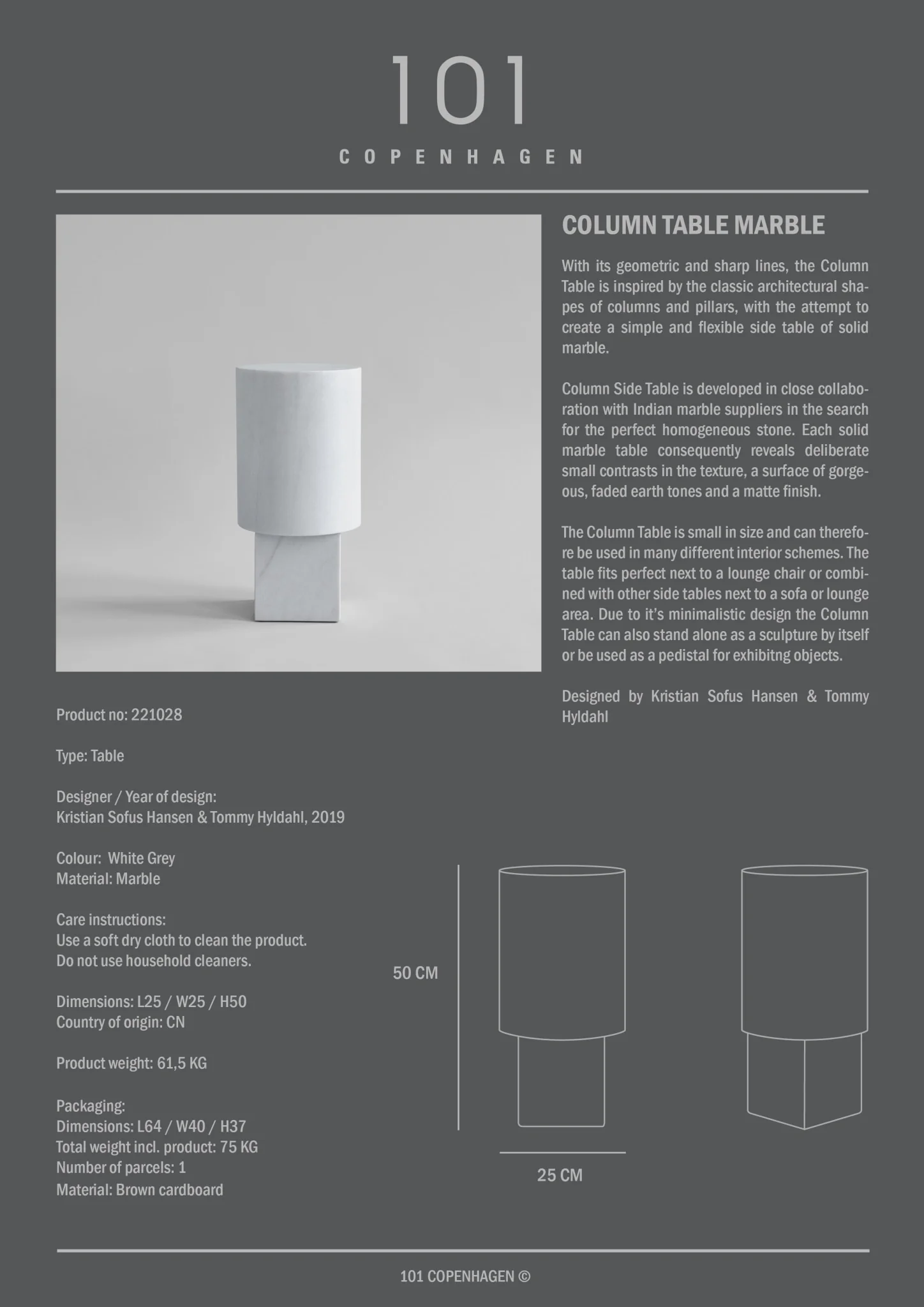 With its geometric and sharp lines, the Column Table is inspired by the classic architectural shapes of columns and pillars, with the attempt to create a simple and flexible side table of solid marble. Column Side Table is developed in close collaboration with Indian marble suppliers in the search for the perfect homogeneous stone. Each solid marble table consequently reveals deliberate small contrasts in the texture, a surface of gorgeous, faded earth tones and a matte finish. The Column Table is small and can therefore be used in many different interior schemes. The table fits perfect next to a lounge chair or combined with other side tables next to a sofa or lounge area. Due to its minimalistic design the Column Table can also stand alone as a sculpture by itself or be used as a pedestal for exhibiting objects. Designed by Kristian Sofus Hansen & Tommy Hyldahl.