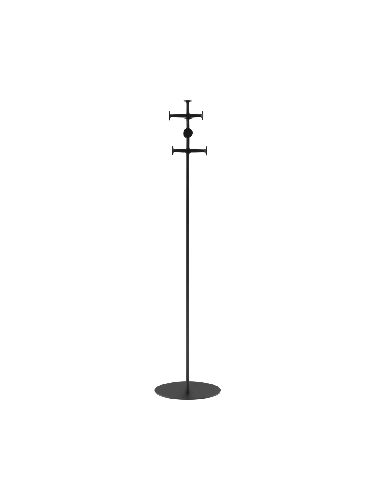 Inspired by Bauhaus and modernist principles, Afteroom Coat Stand is anchored by a powder-coated steel base. Two poles rise to support eight hooks, arranged with deliberate spacing to accommodate coats, scarves, hats or hangers without crowding.