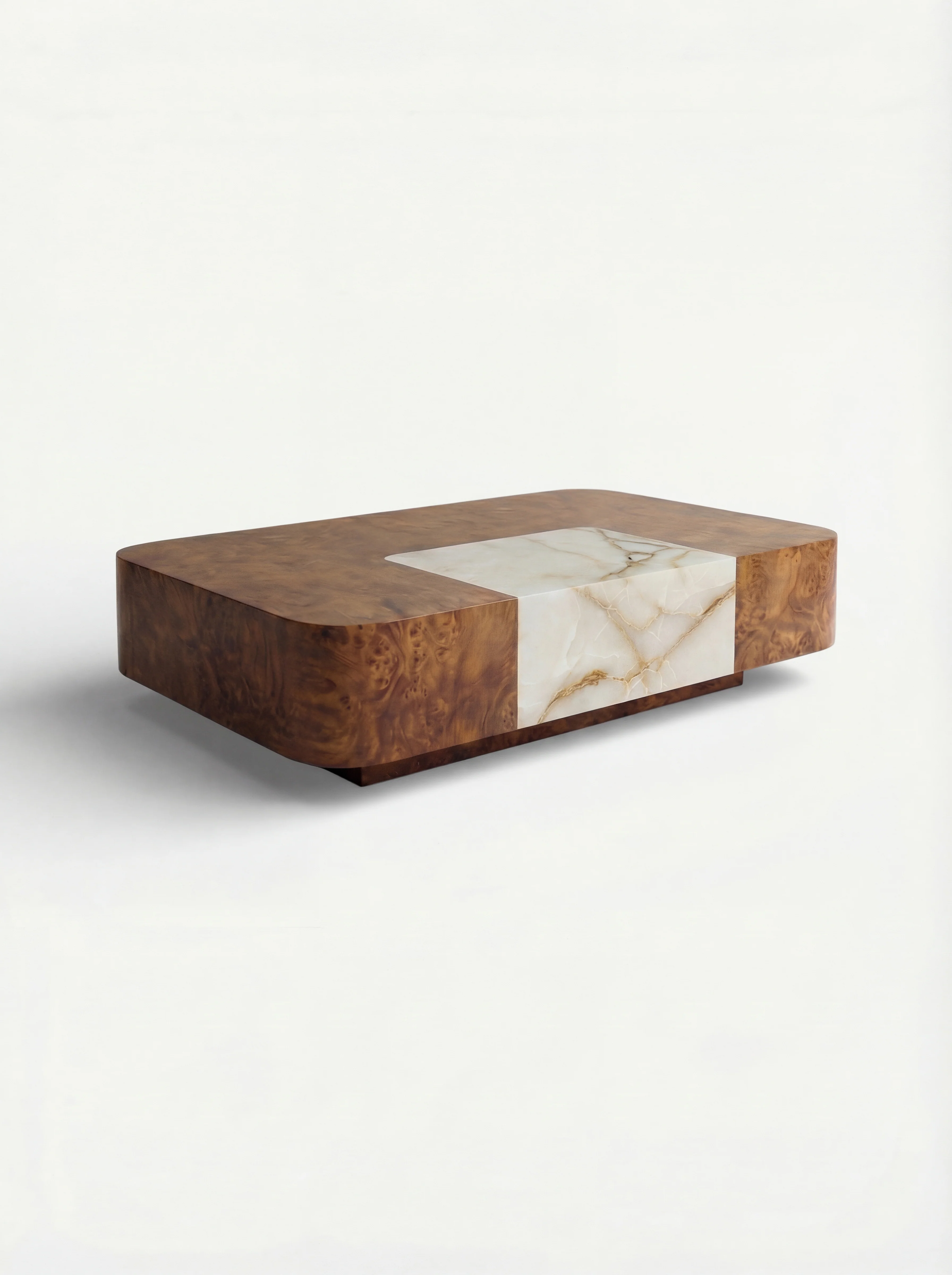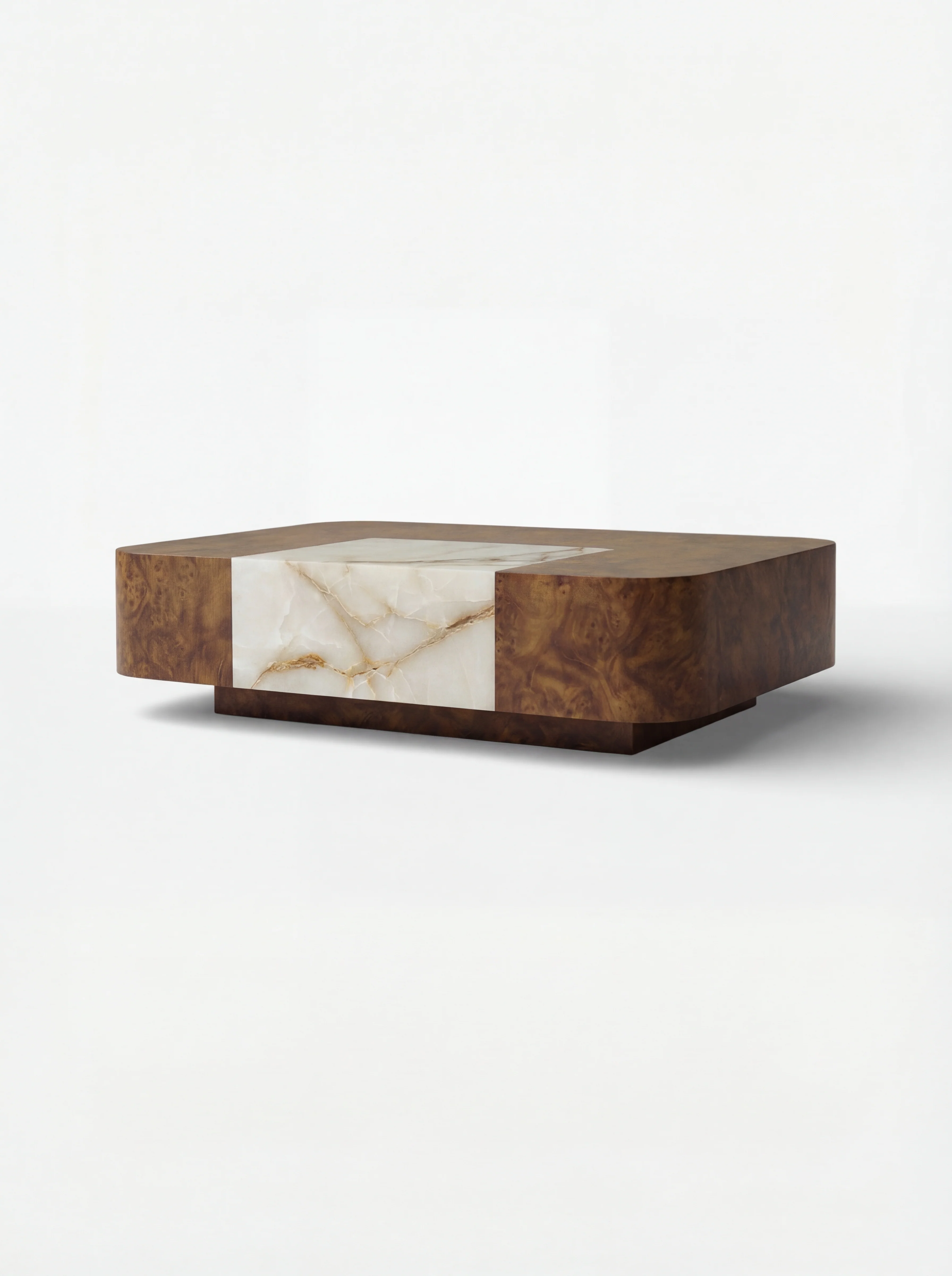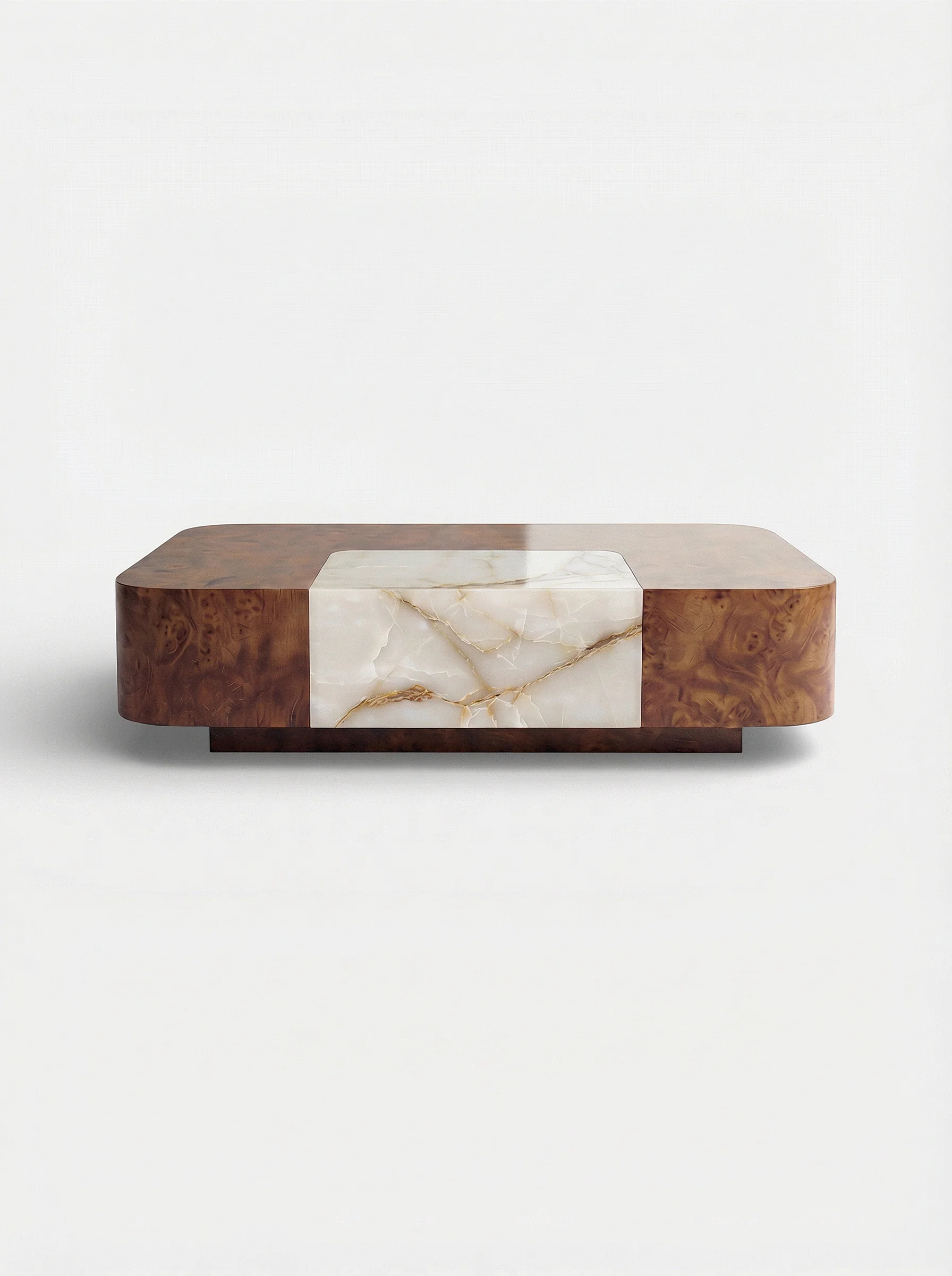 The Solo Baci Square coffee table in burl wood with an integrated onyx shell heart is designed to be elegant, sophisticated, modern, and timeless. Its contemporary square shape and balanced volumes are in perfect harmony with the precious materials selected.