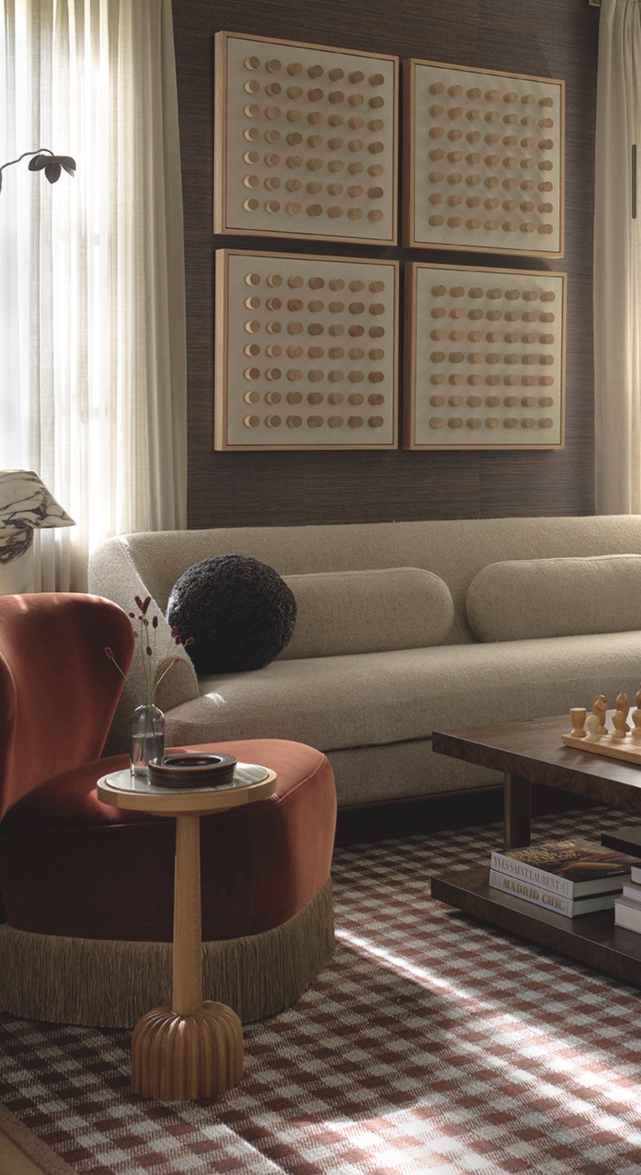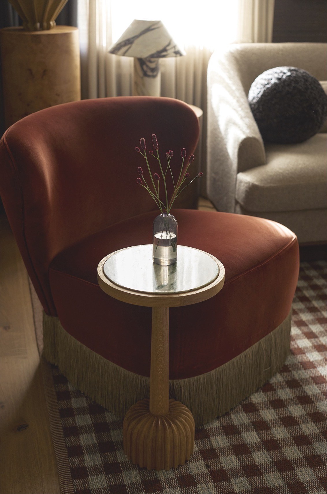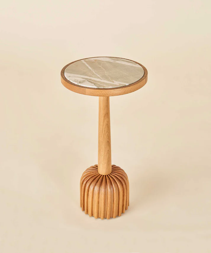 Cocktail table featuring reeded solid oak base and inset fairy verderra green marble top. Fairy Verderra marble is a natural stone, so variations will occur.