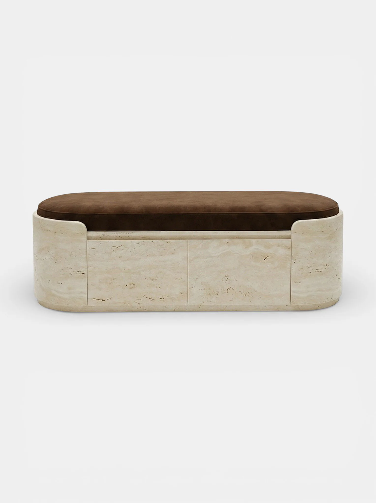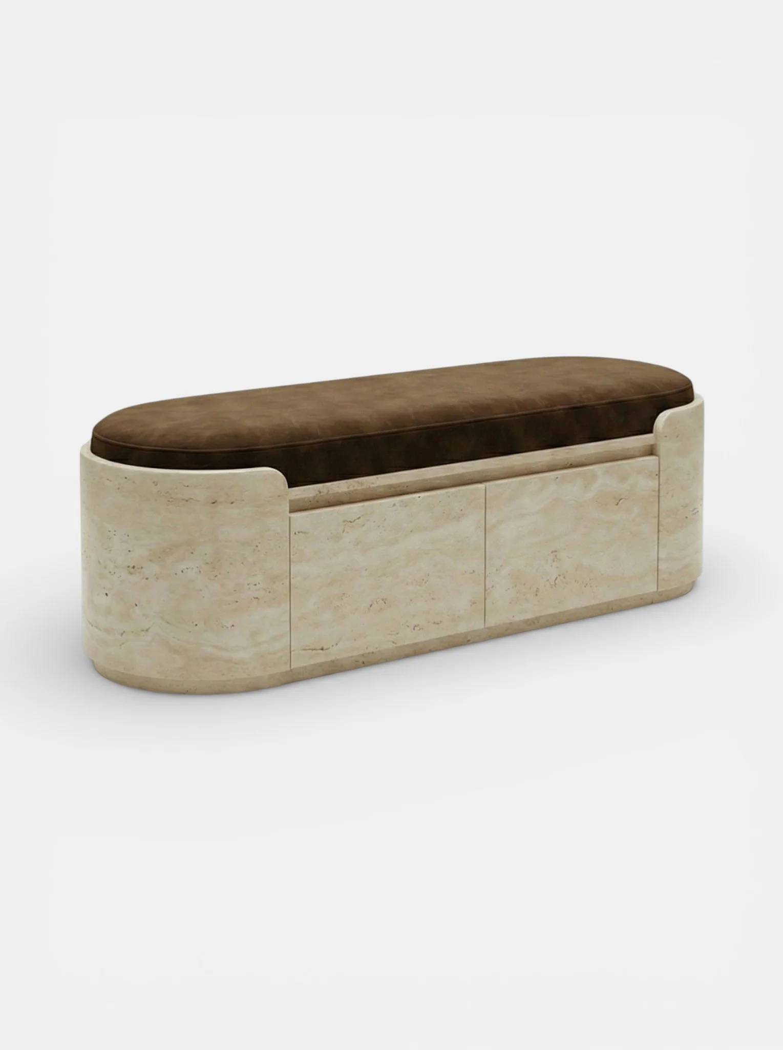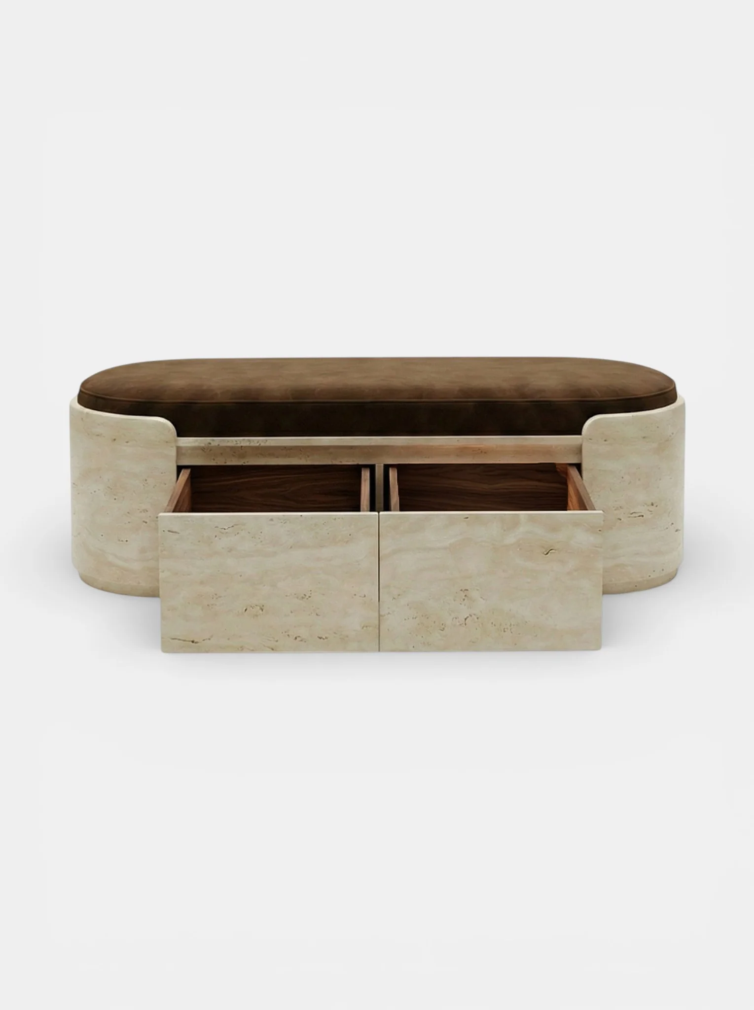 The Chloé bench is an elegant statement piece that embodies timeless luxury and architectural refinement. Crafted entirely in natural travertine, its softly rounded silhouette highlights the stone’s delicate veining and warm, mineral tones, giving each piece a unique character. Chloé features discreet integrated storage compartments, finished in rich wood interiors that bring warmth and contrast to the stone. These hidden drawers offer practical storage while preserving the bench’s clean, sculptural lines.
