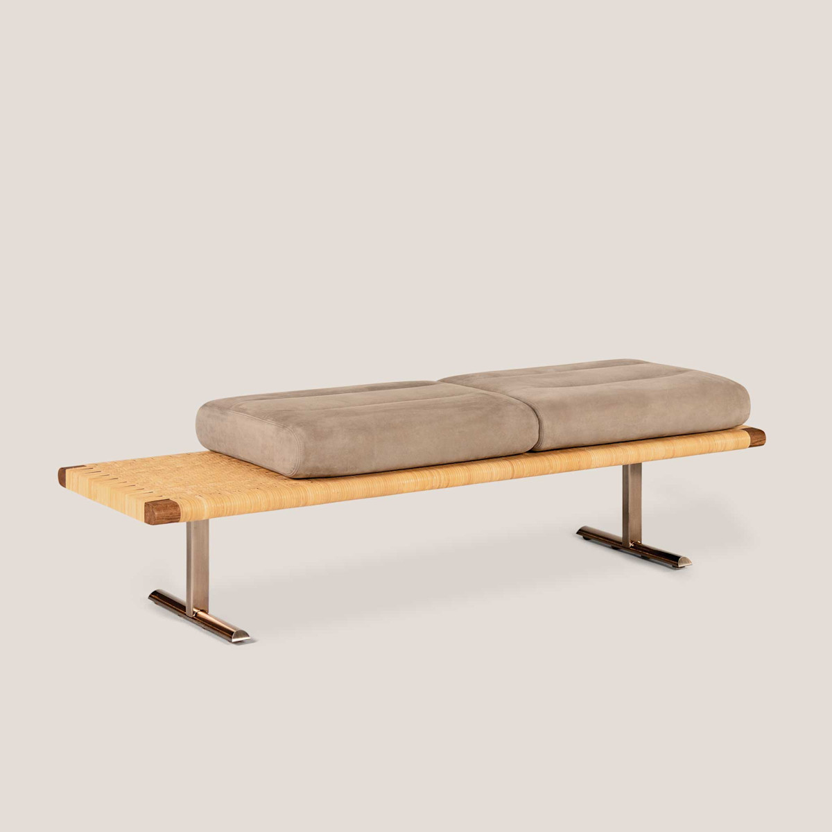 Walnut stained ash frame wrapped with natural rattan, and smoked bronze base
