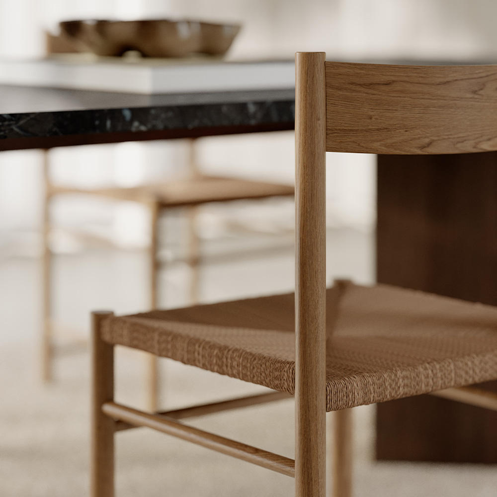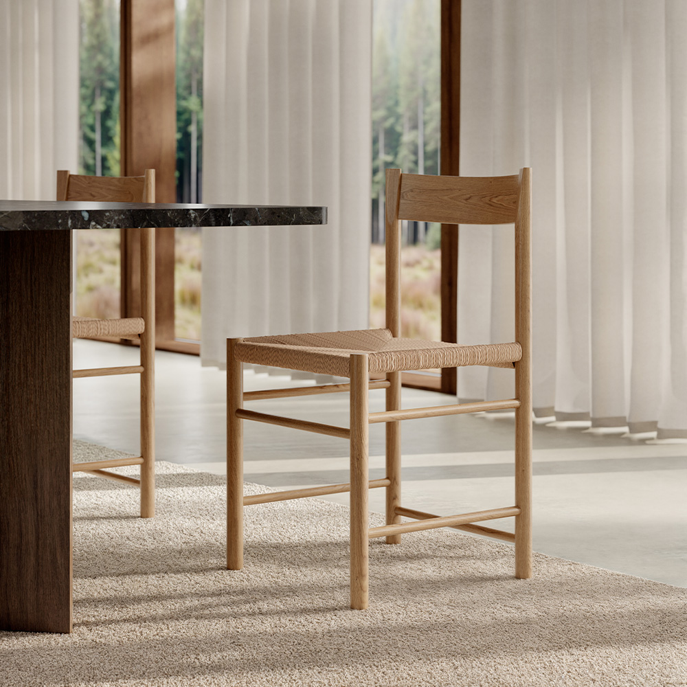The F Chair is a contemporary shaker chair based on the virtues of traditional craft. It carries on the folksy simplicity and honesty of the archetypical shaker chair, but with a modern comfort and a clean-cut, geometricaland minimalistic appearance.
