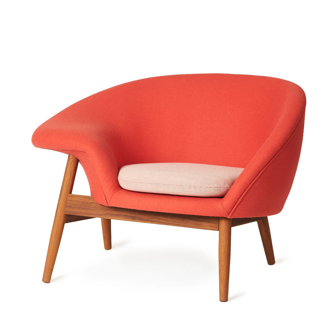 Unique asymmetrical armchair, designed by the renowned Danish architect Hans Olsen. Fried Egg is rooted in the Danish modernism of the 50s and caters to design lovers who want to add edge to the home in the form of extraordinary design furniture with both personality and whimsy. Due to Fried Egg's characteristic shape, the spacious as well as graceful chair has been nicknamed the Mirror Bed, because this is exactly what the chair reminds of when the design is viewed from above.