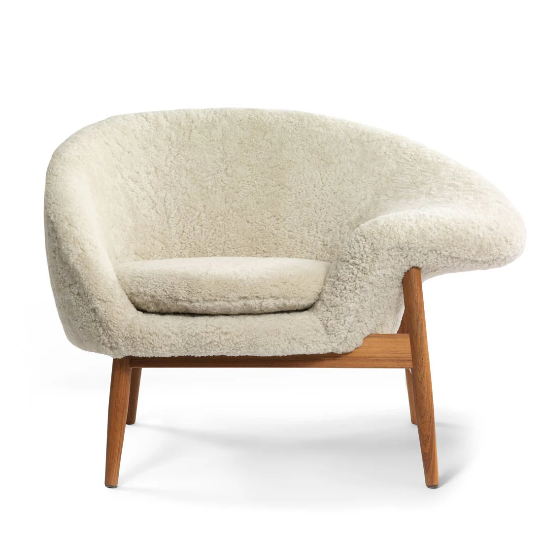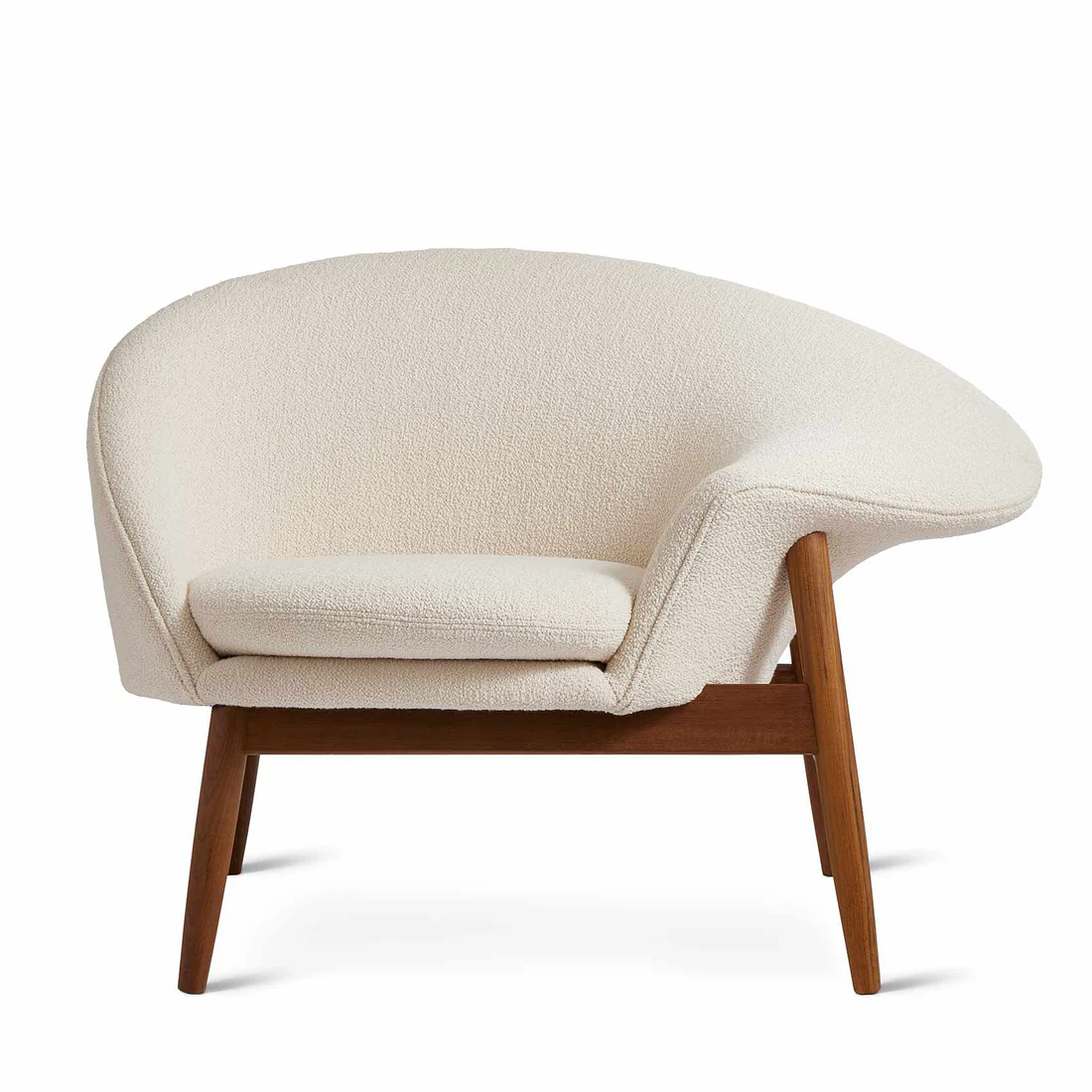 Unique asymmetrical armchair, designed by the renowned Danish architect Hans Olsen in the 50s. Fried Egg is also available in an exclusive anniversary edition with sustainable textile, launched on the occasion of the 100th anniversary of Hans Olsen's birth. The Fried Egg armchair with personality and whimsy is now finally available for design lovers who want to add edge to the home in the form of a unique design piece of furniture rooted in Danish modernism.