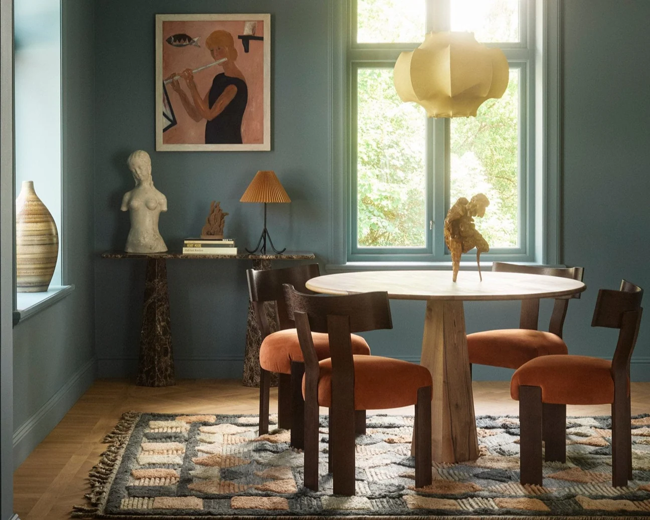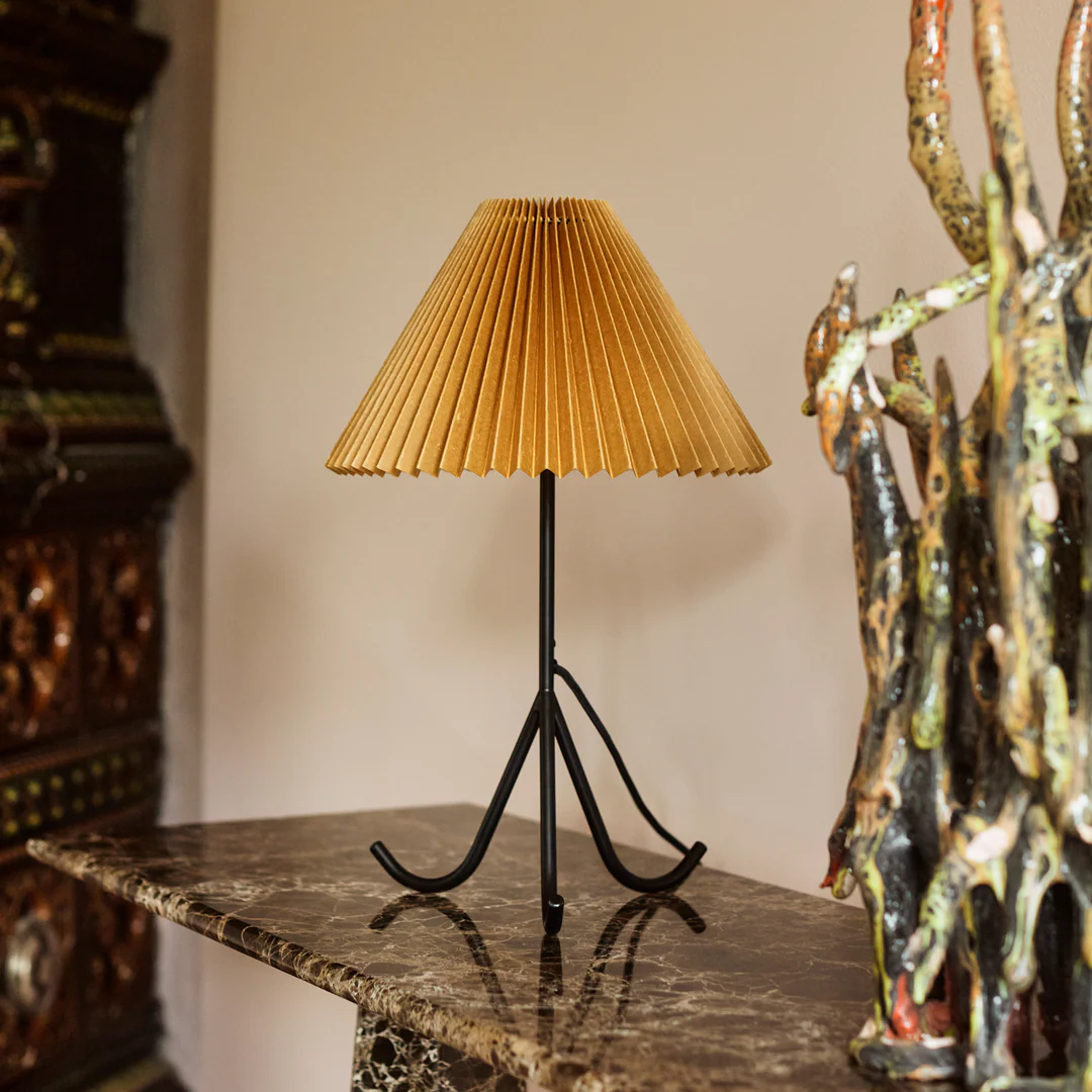 Geraldine Table Lamp is a chic lamp featuring a distinctive pleated shade in a vibrant mustard hue. Its base, designed with elegant simplicity, consists of three slender black legs. The pleated textile shade in waxed paper not only adds texture but also casts a warm, inviting light throughout the room.