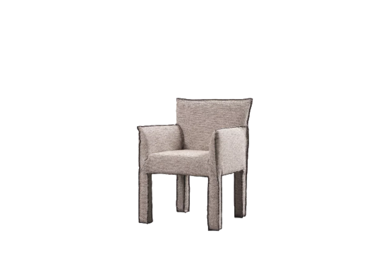 Dining chair characterised by a squared back and legs whose shapes are softened and entirely enveloped by an upholstered cover that runs along the entire seat and highlights its profile and minimalist structure, characterised by clean, defined geometries. Available in 2 sizes - please check the spec sheet.