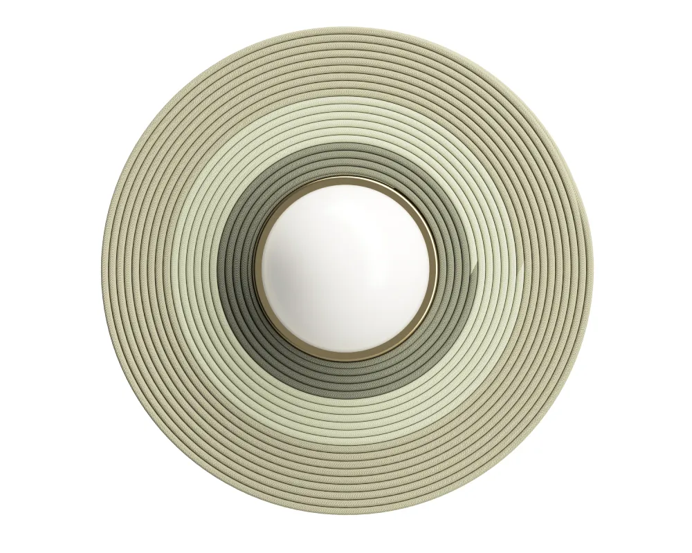 A refined fusion of form and function, the Iris wall sconce features a hand-wrapped woven cord disc. Designed to provide acoustic softness and textural warmth with a touch of color.