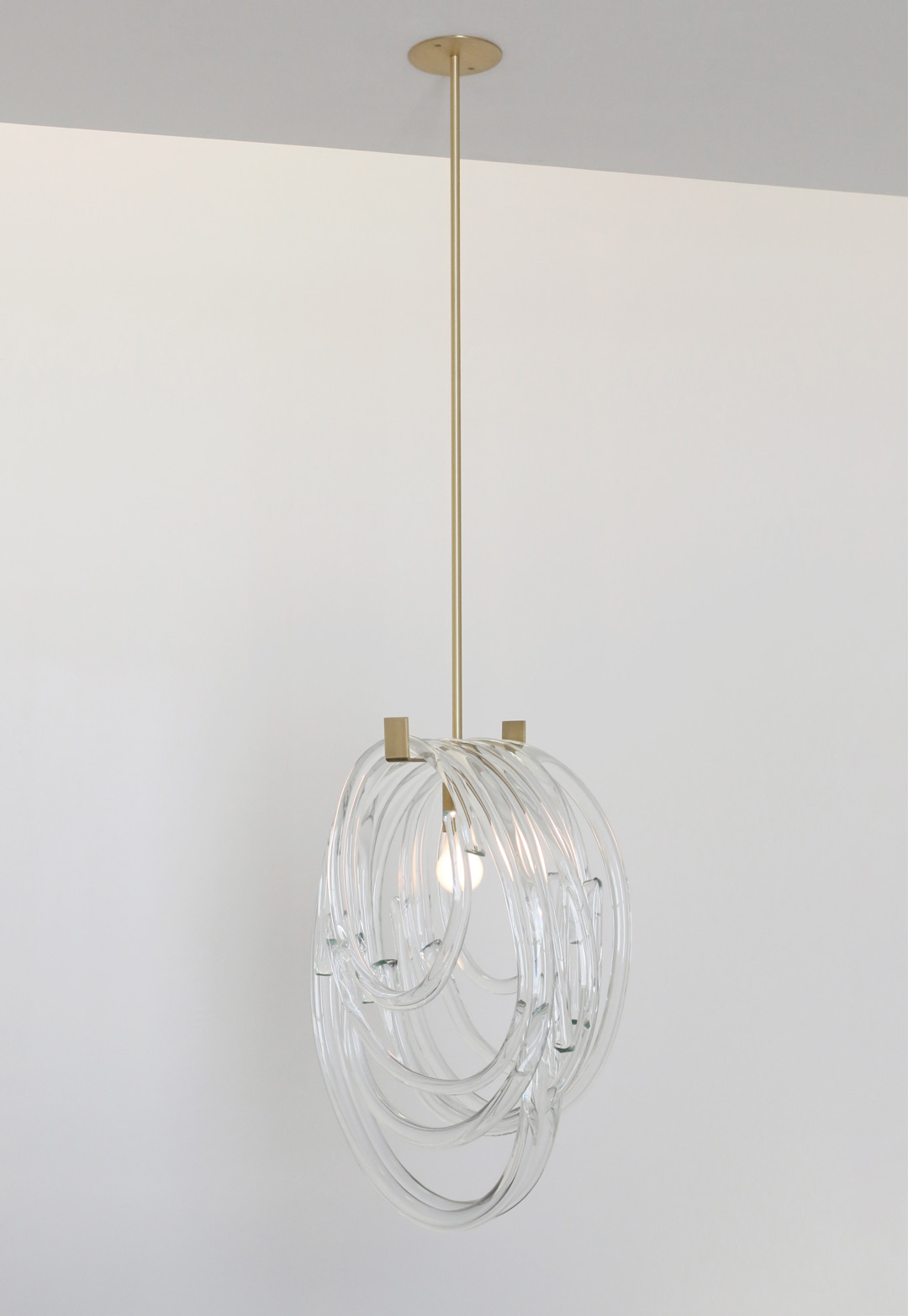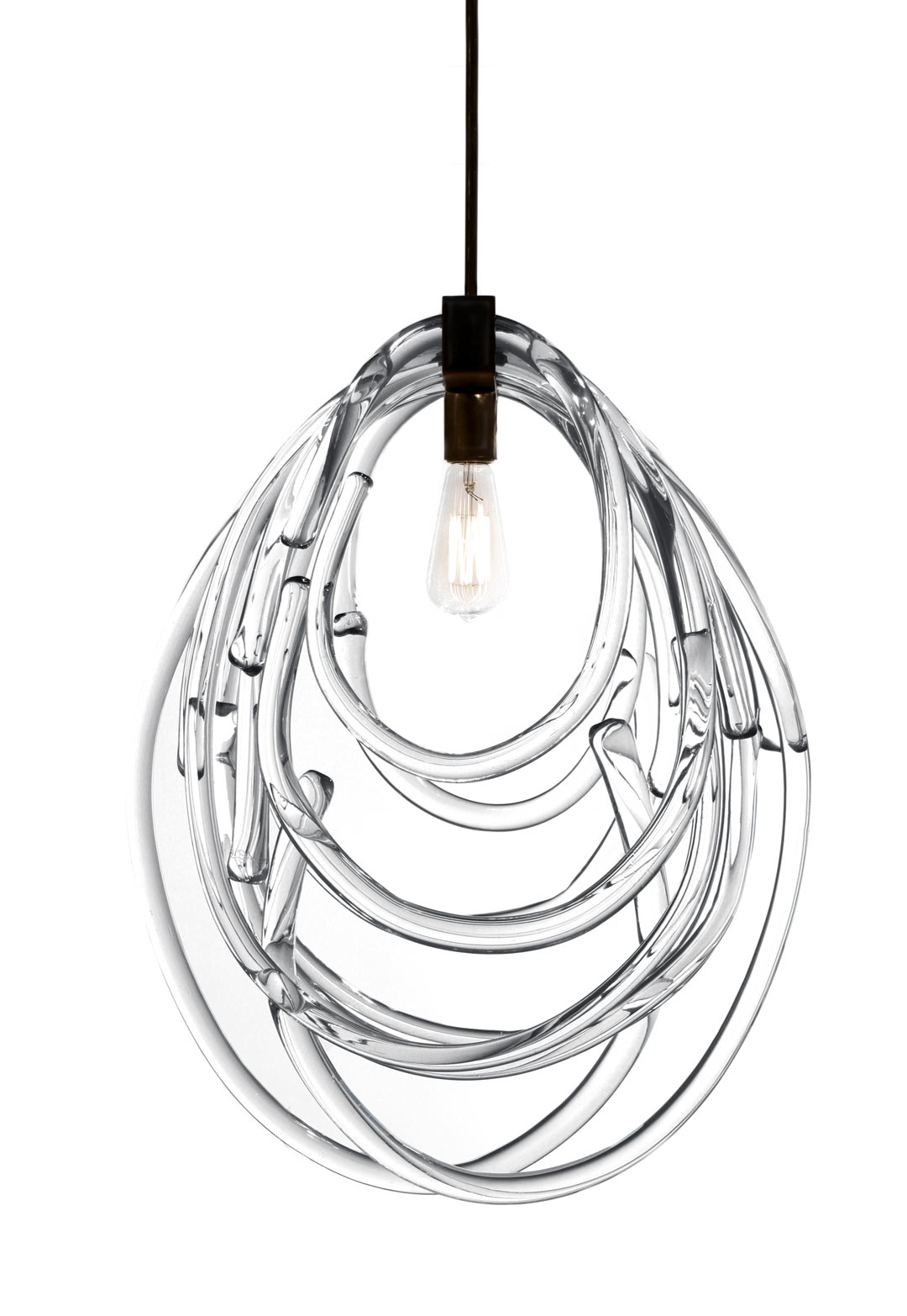 Solid loops of handblown glass serve as a shade for this sculptural pendant. The glass loops come in different sizes, showcasing the amazing quality and clarity of the Czech glass. Each loop is made by hand, so each is unique and slightly different, lending the finished composition a very organic feel.