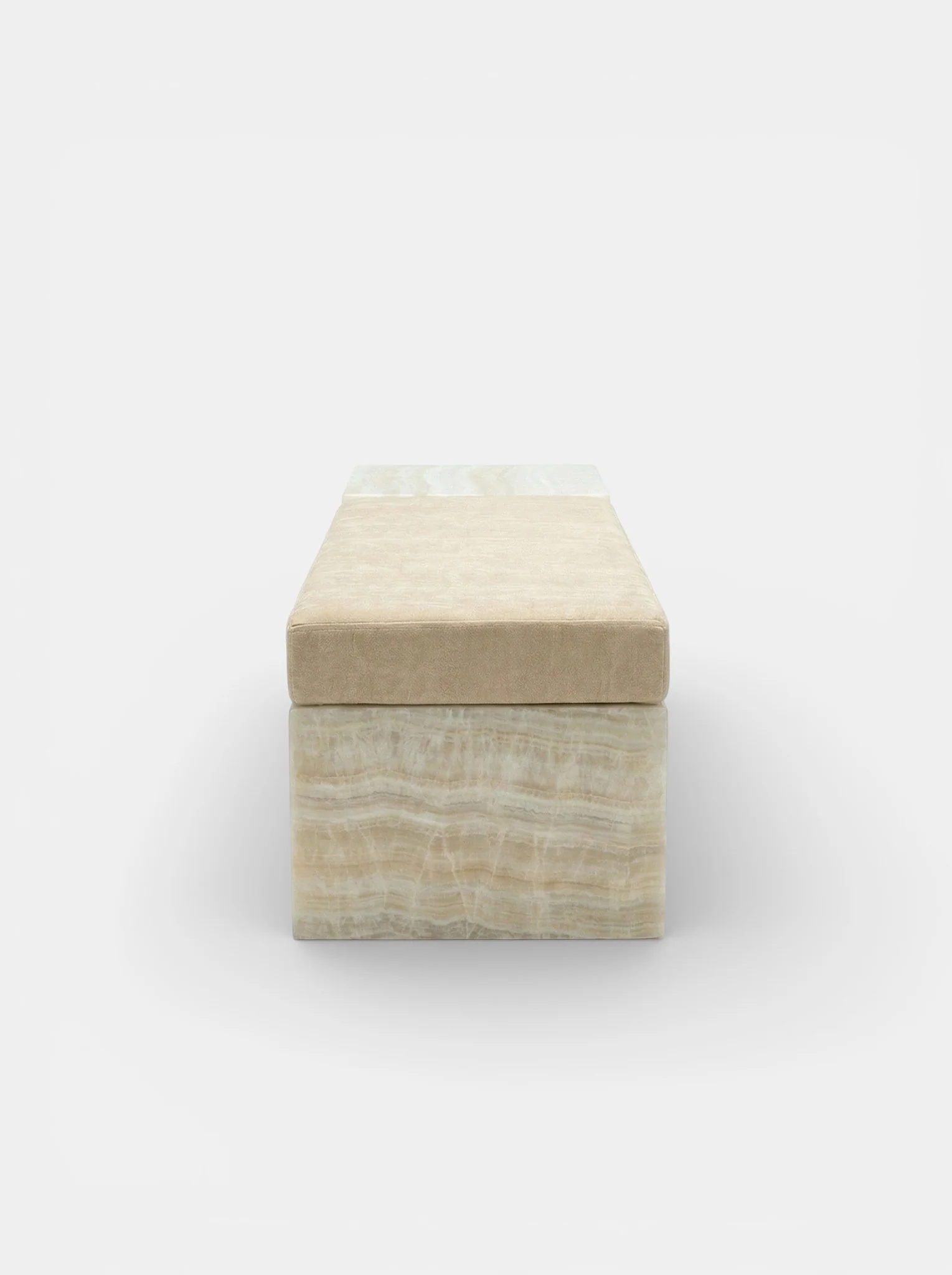 The Meryl Bench pairs a sculptural base in Ivory Onyx with a plush seat upholstered in Pierre Frey mohair. Refined and timeless, its clean lines and soft texture create a subtle statement for any interior.