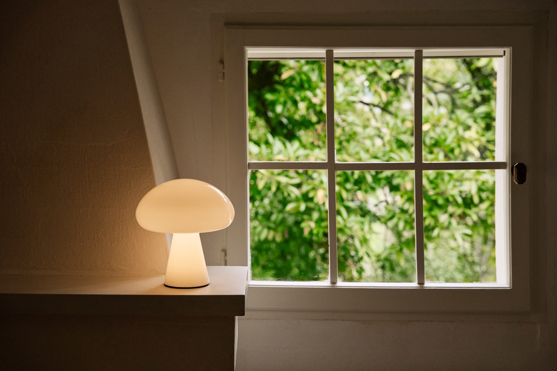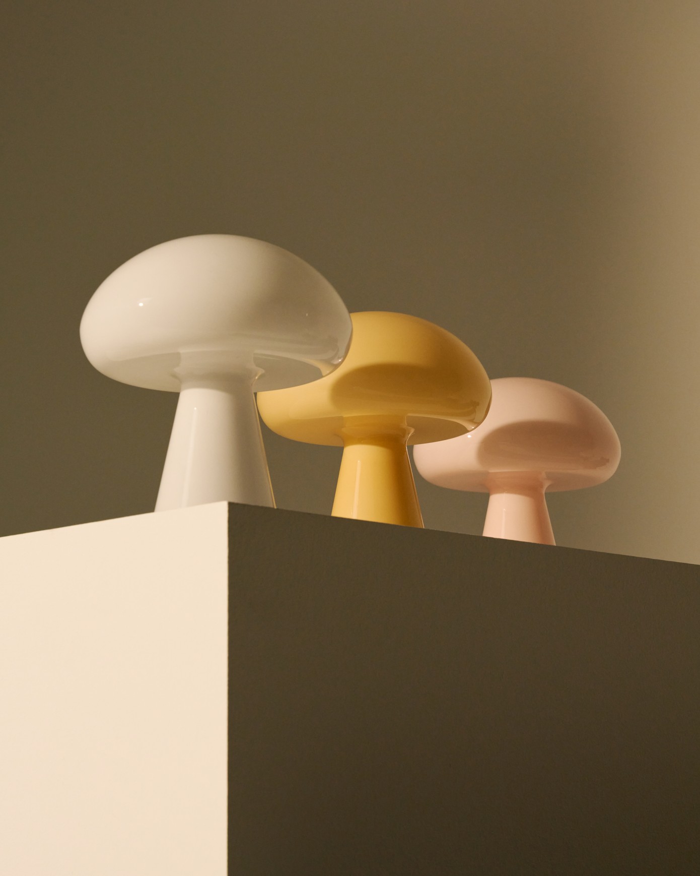 Bill Curry’s Obello Portable Lamp has become an icon of the GUBI Collection, embodying the optimism of the Space Age in a mushroom silhouette. The glossy edition introduces three pastel colorways – Mellow Yellow, Powder Pink, and Pearl White – crafted in opal mouth-blown glass with a luminous lacquered finish.