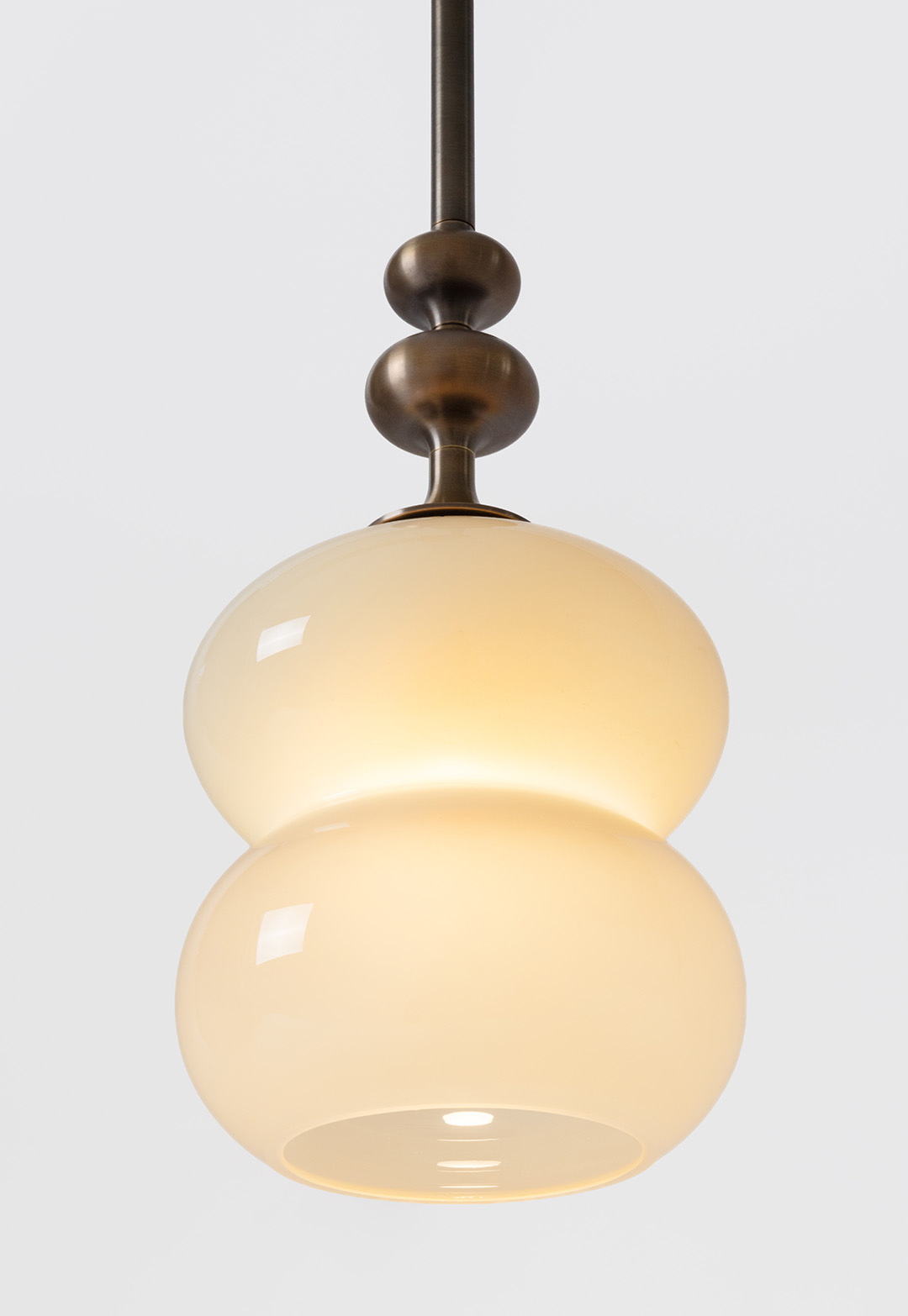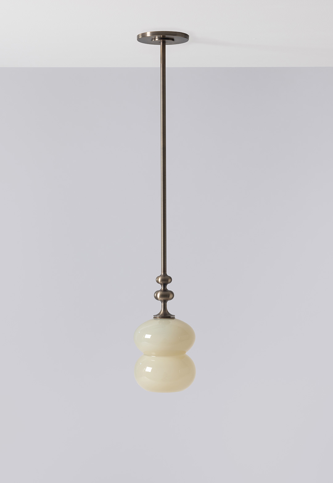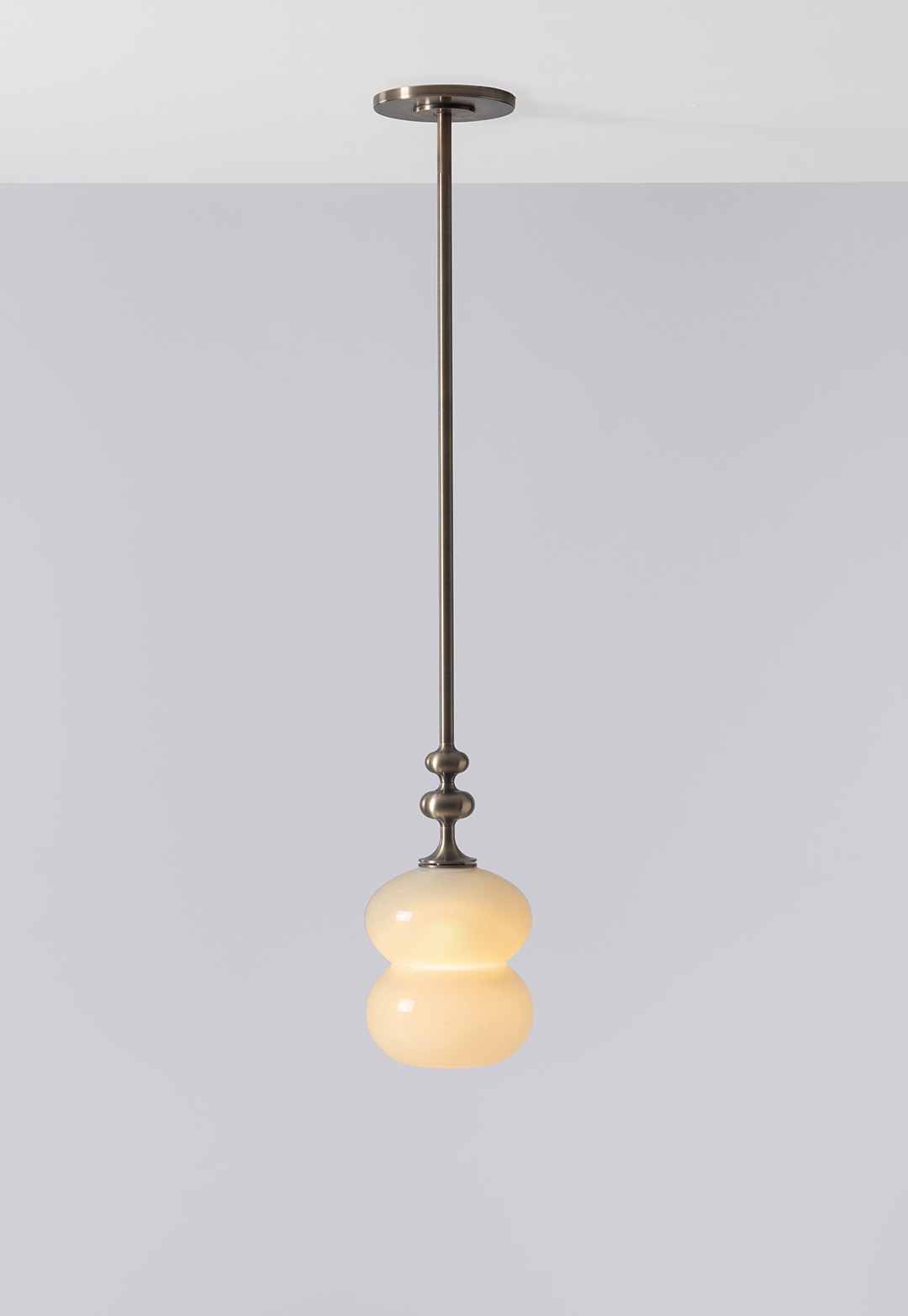 The curving lines of its handblown glass give the Oestre Pendant its understated elegance. The double-ellipsoid shape gives it presence, while the opaque glass gives a soft glow. The pendant stem transitions above the glass into a decorative metal profile.