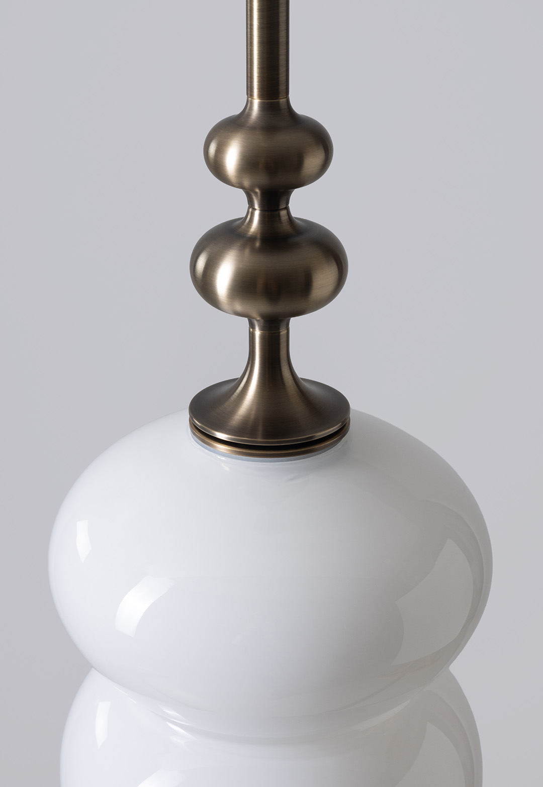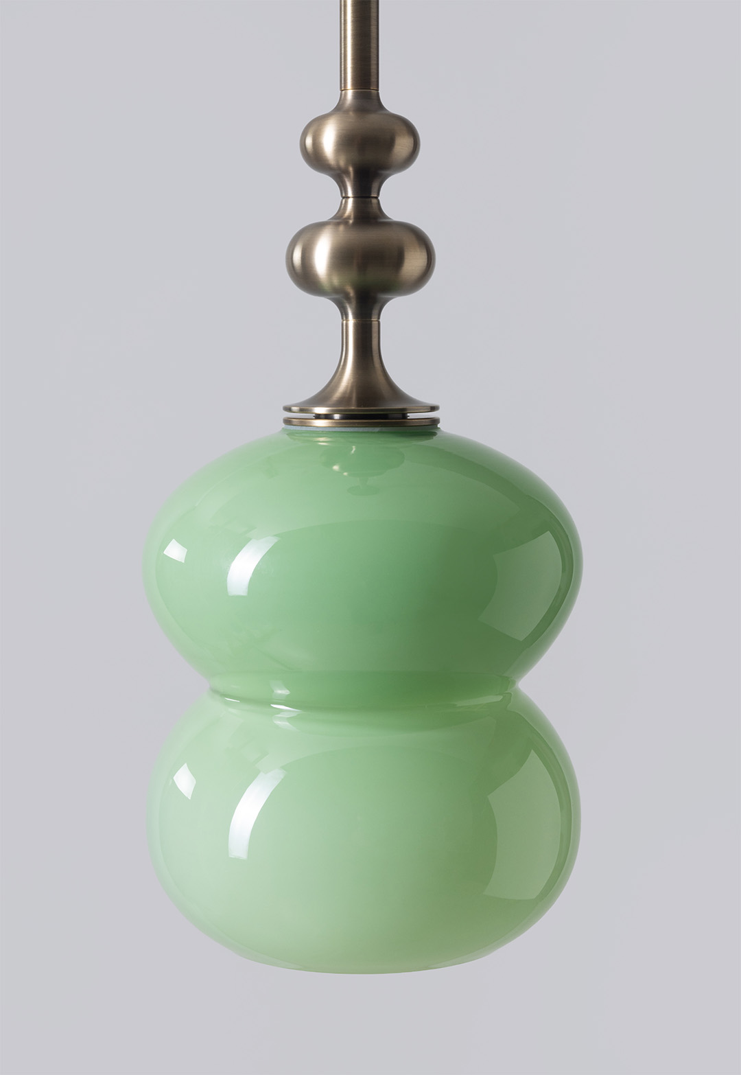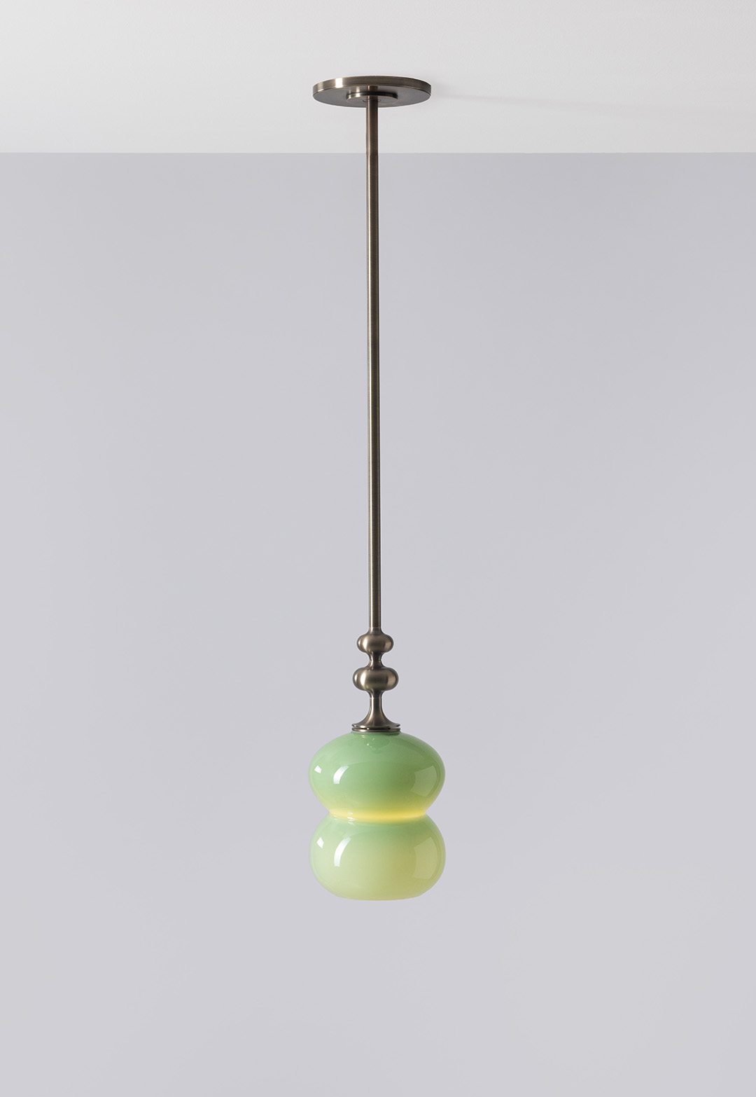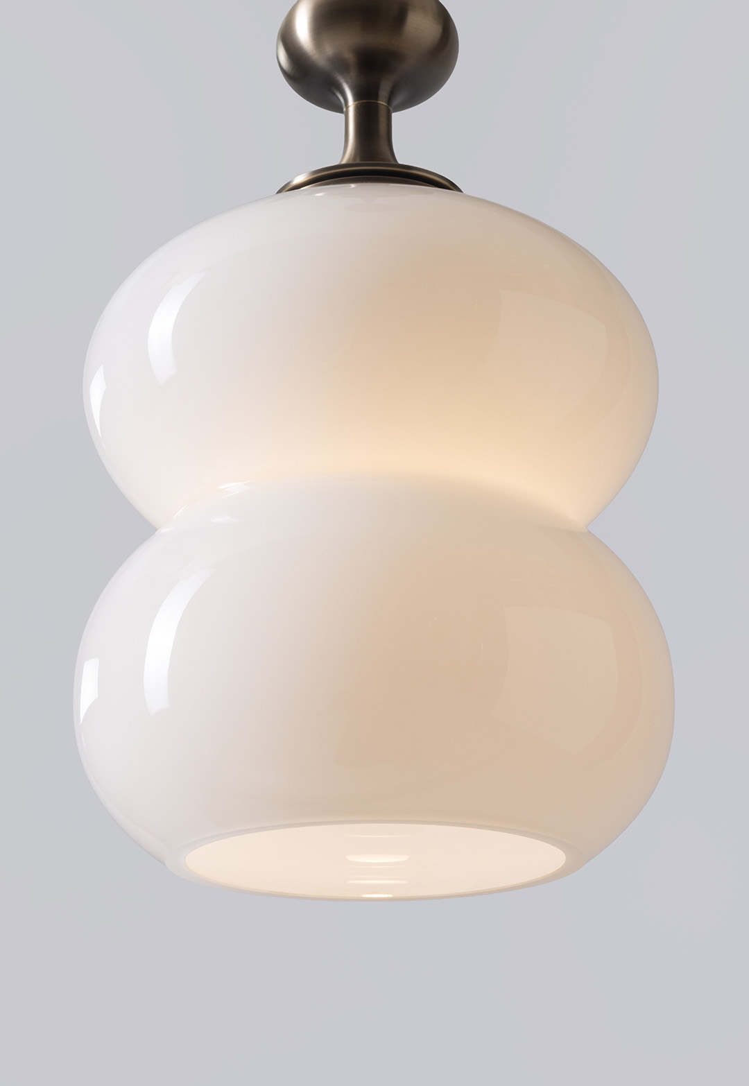 The curving lines of its handblown glass give the Oestre Pendant its understated elegance. The double-ellipsoid shape gives it presence, while the opaque glass gives a soft glow. The pendant stem transitions above the glass into a decorative metal profile.