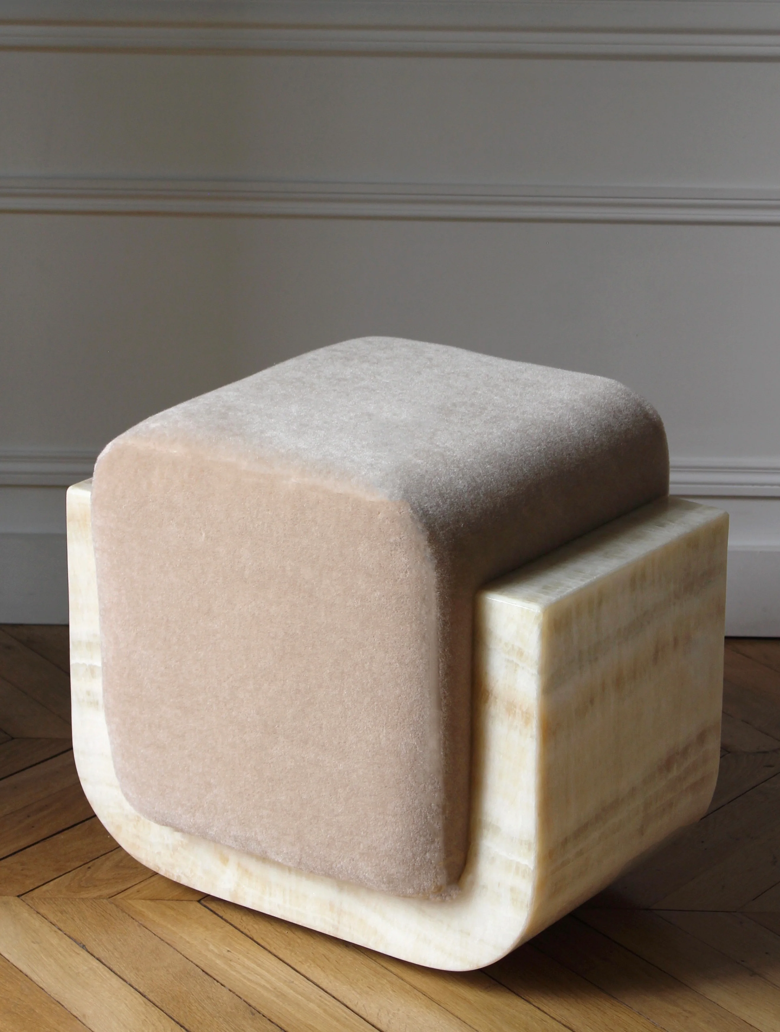 A perfect blend of luxury and functionality. This exquisite piece features a rounded onyx base that exudes elegance and sophistication. The cushion, nestled inside, is a rounded square, providing a modern contrast to the smooth curves of the onyx.