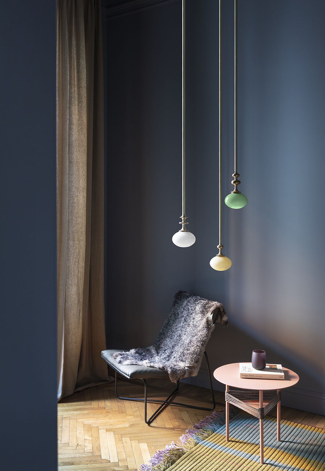 The designs of the Perla lighting series feature glowing ellipsoids of handblown glass with decorative brass hardware. The pendant stem transitions above the glass into a decorative metal profile. The Perla Pendant is simple and understated.