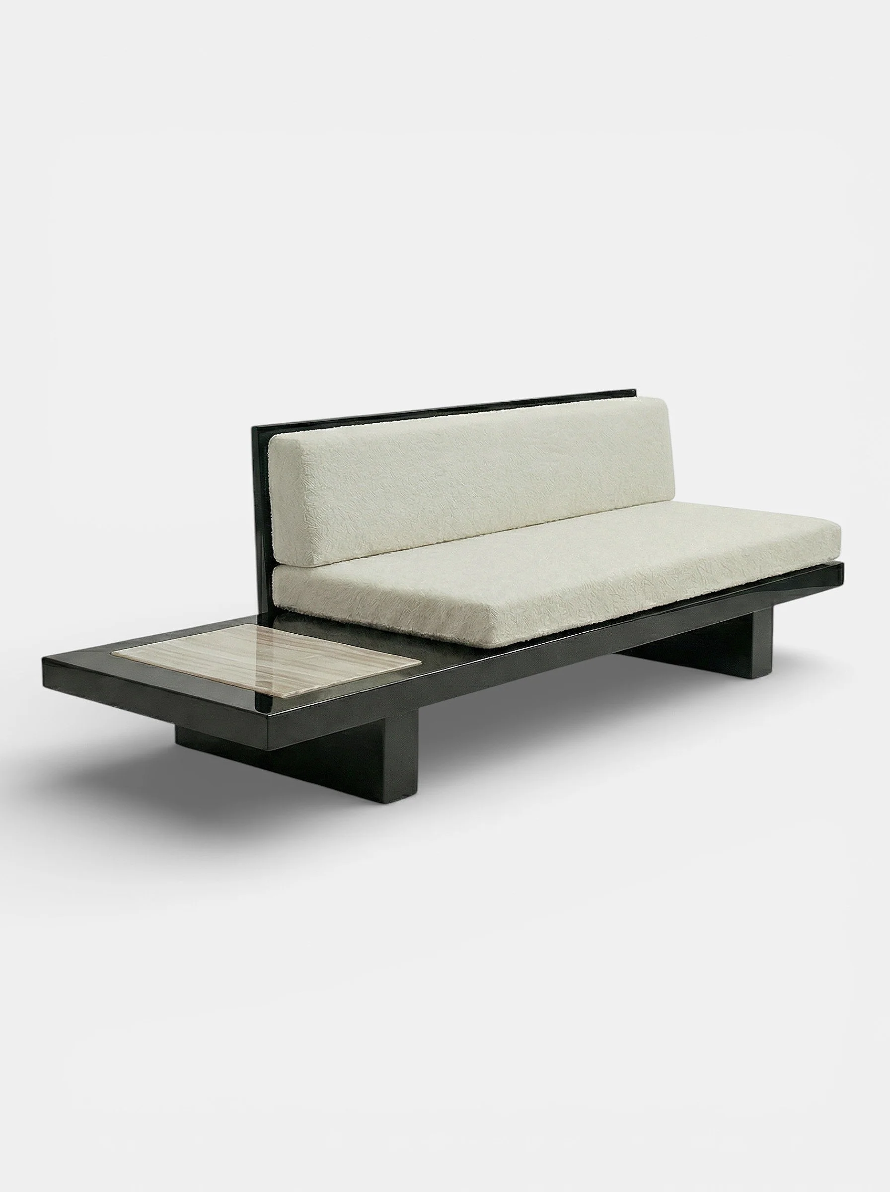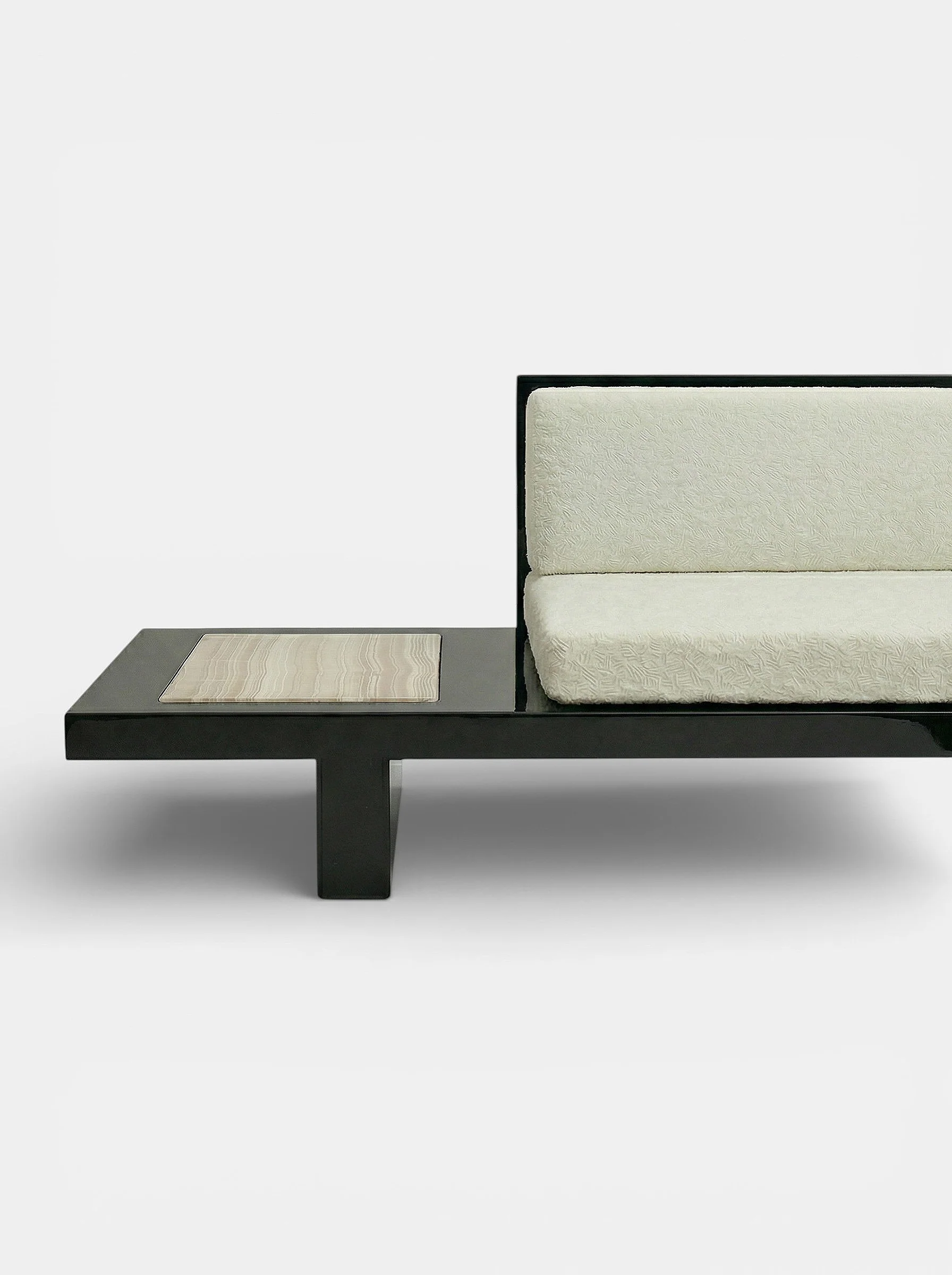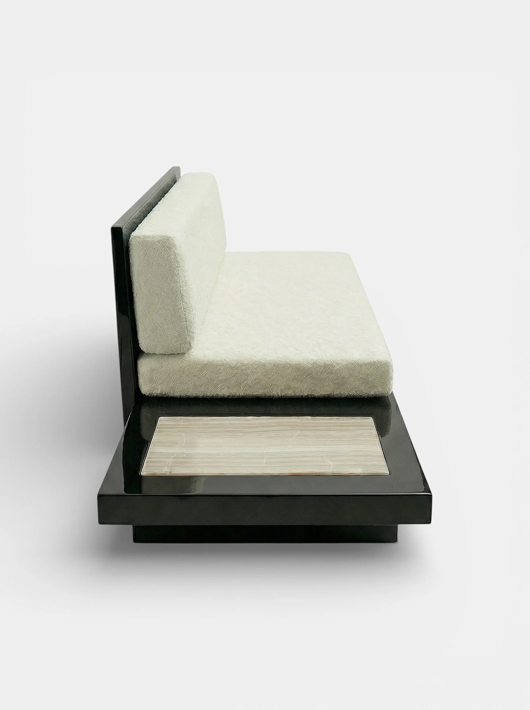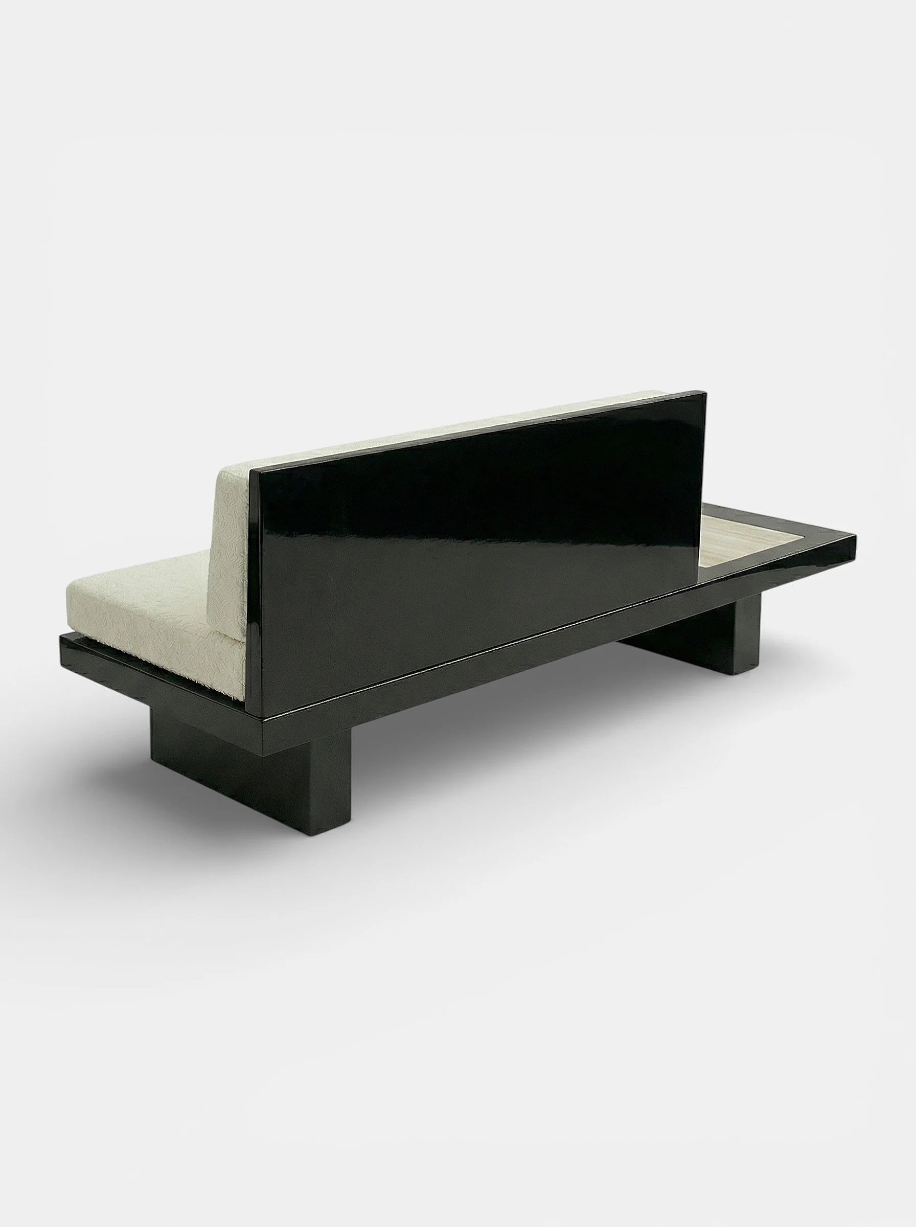 The Pheobe Bench is a bold expression of sculptural minimalism, where refined materials meet architectural lines. Crafted in high-gloss black lacquered wood, its elongated silhouette rests on solid block legs, creating a striking, grounded presence.
