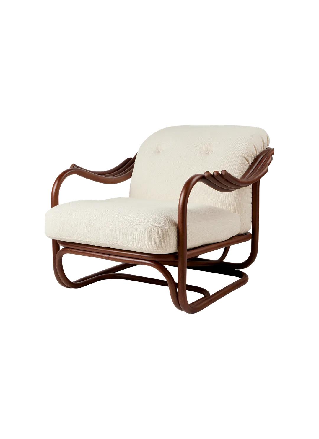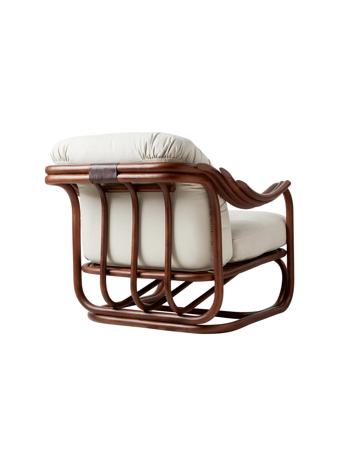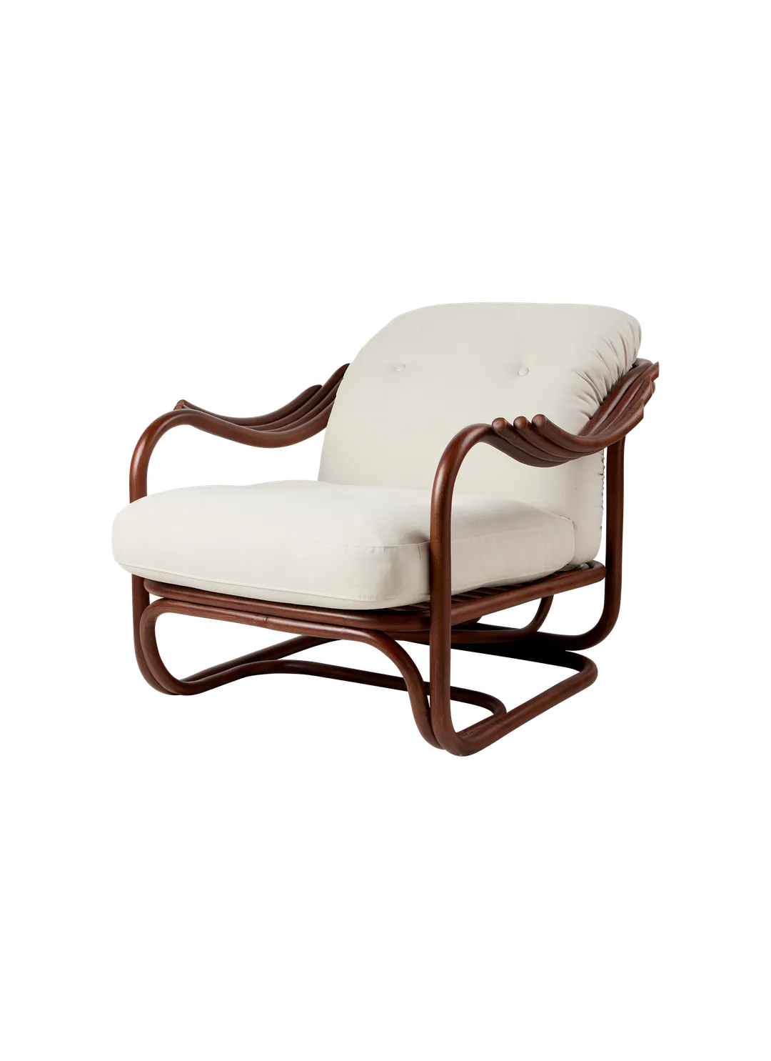 Seamlessly merging the inherent beauty and charm of natural rattan with meticulous ergonomic precision, the Poltrona Tria Lounge Chair embodies both artistry and function. Constructed almost solely from steam-bent rattan canes, curved and fixed into place by hand, it features a distinctive set of gracefully contoured armrests, creating a visually striking yet supremely comfortable seat. Enhanced by two deep-set cushions, the Poltrona Tria delivers an exceptional lounging experience in any indoor setting - while the natural material expressions bring a welcome touch of the outdoors into the home.