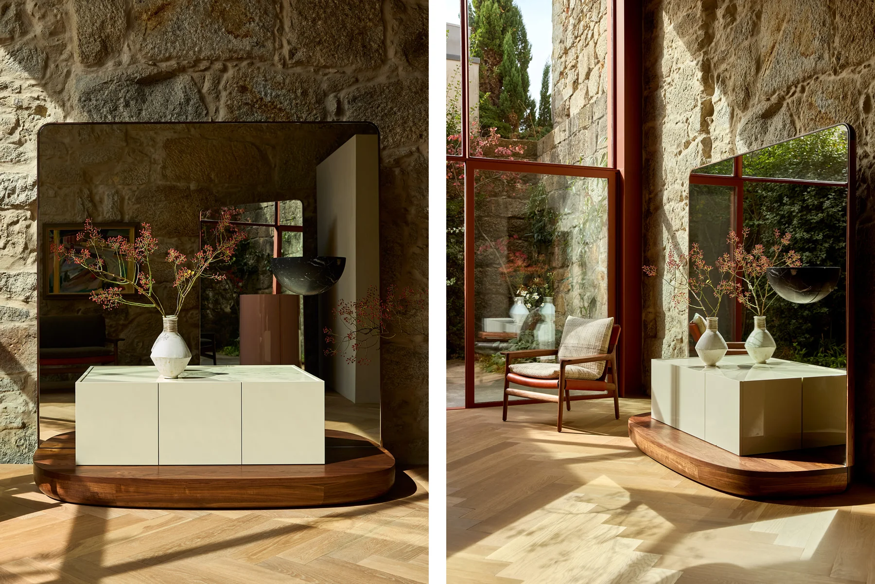 Tai Dan 2 features an expansive mirror that adds dimension to interiors, while its expertly crafted timber frame and base bring grounding and warmth. The integrated cabinet provides practical storage space in a lustrous lacquer body and a floating geometric surface in terrazzo or stone offers a playful and utilitarian accent.