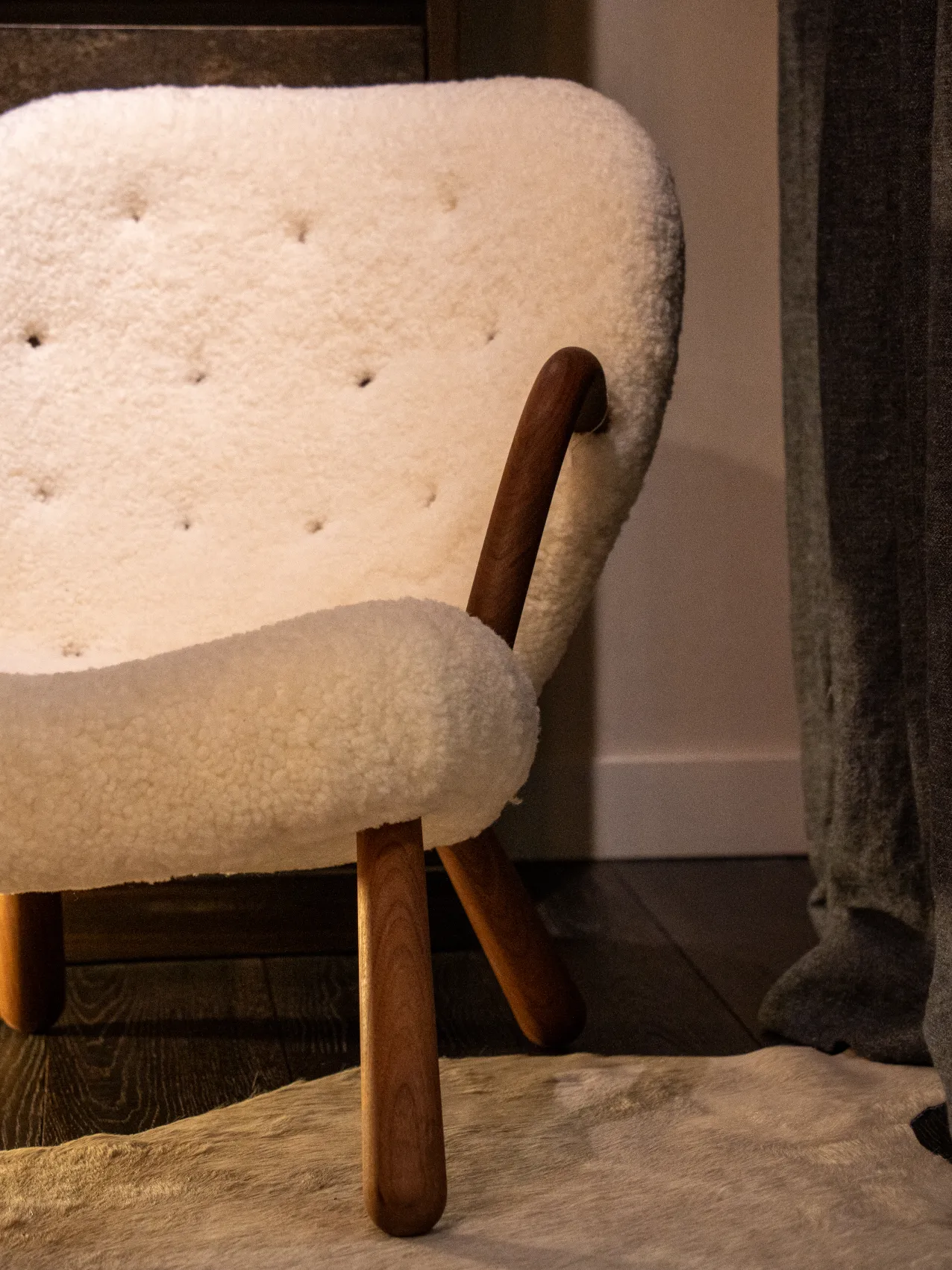 The clam chair originally designed by Phillip Arctander in 1944 and manufactured by Paustian in 2016. The chair is upholstered in sheepskin and with arms and legs of oak. Price: $5500.