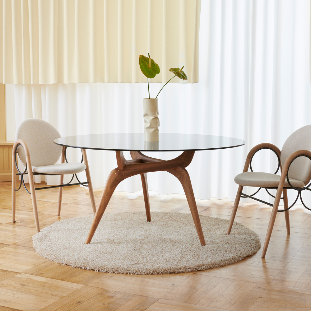 In 1958, Danish architect Hans Bølling sketched a table that blends playful construction with sculptural elegance. Today, Brdr. Krüger brings this vision to life in the TRIIIO Dining Table, where a twisted oak base—reminiscent of growing tree branches— meets a floating glass top, creating a poetic balance between function and form.