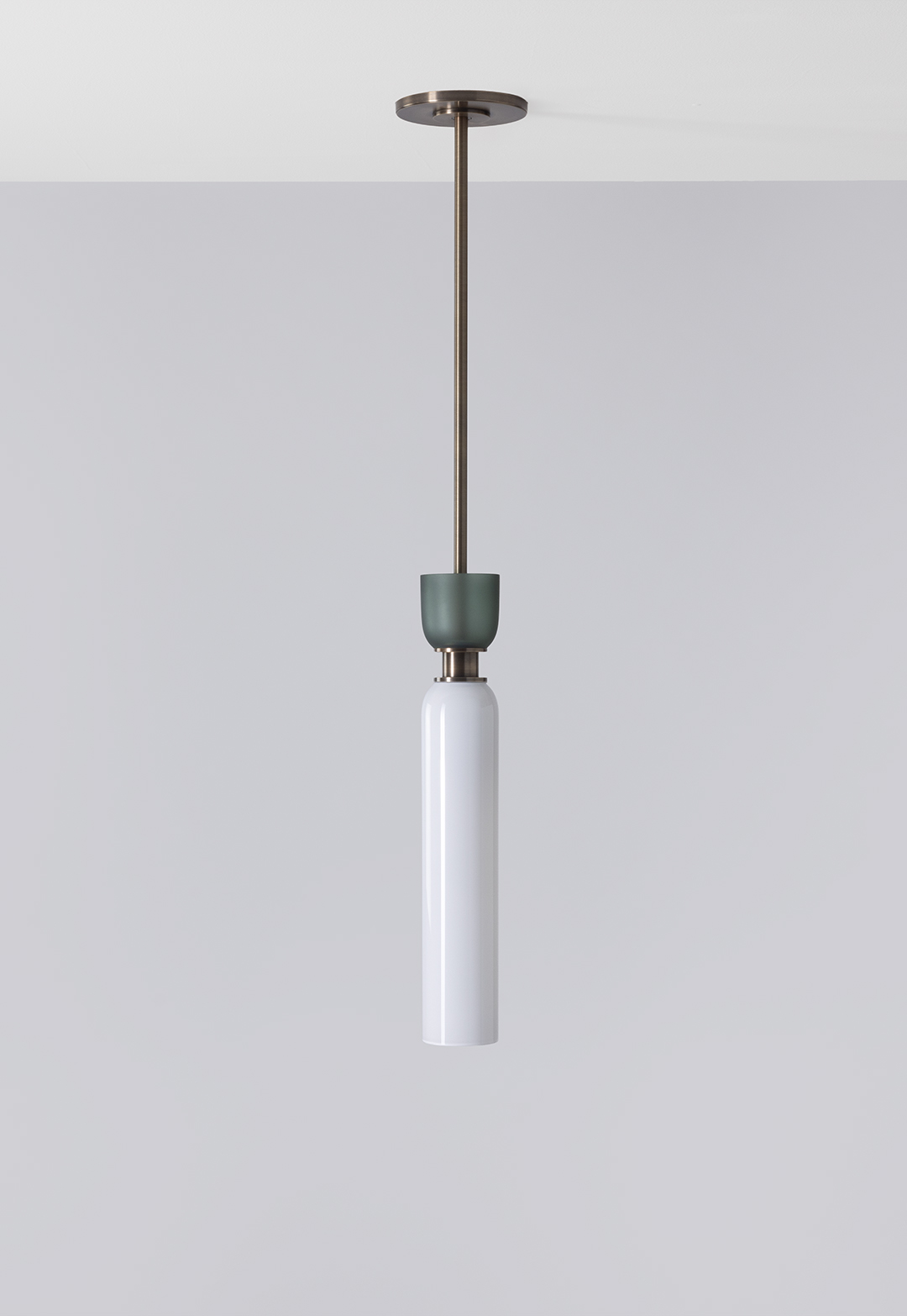 The designs of the Union lighting series combine upward- and downward-oriented glass dome shapes of different proportions in carefully curated palettes that mix color, transparency, and texture. The Union Small Pendant combines a long, narrow, lit dome of opaque glass on the lower half with a smaller, upward-facing dome of frosted glass.